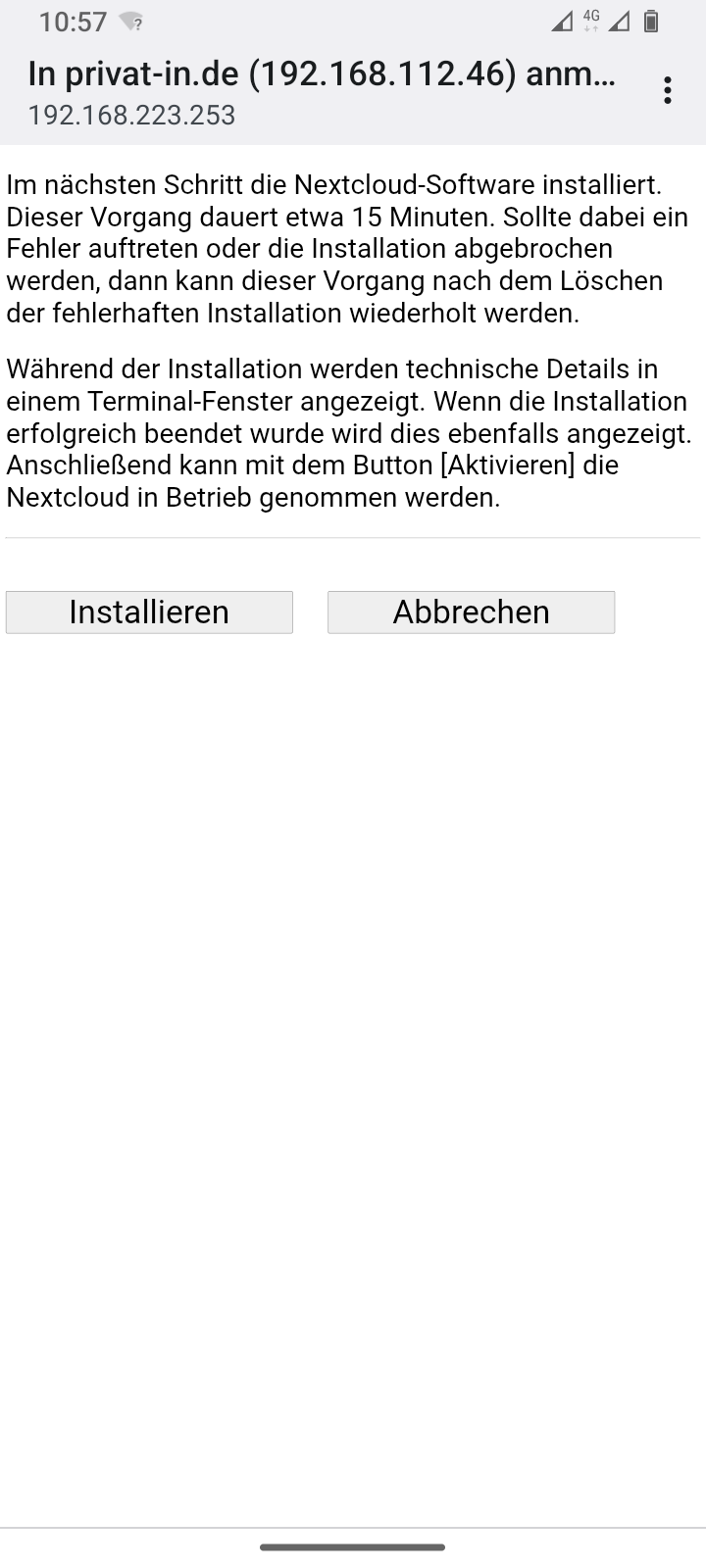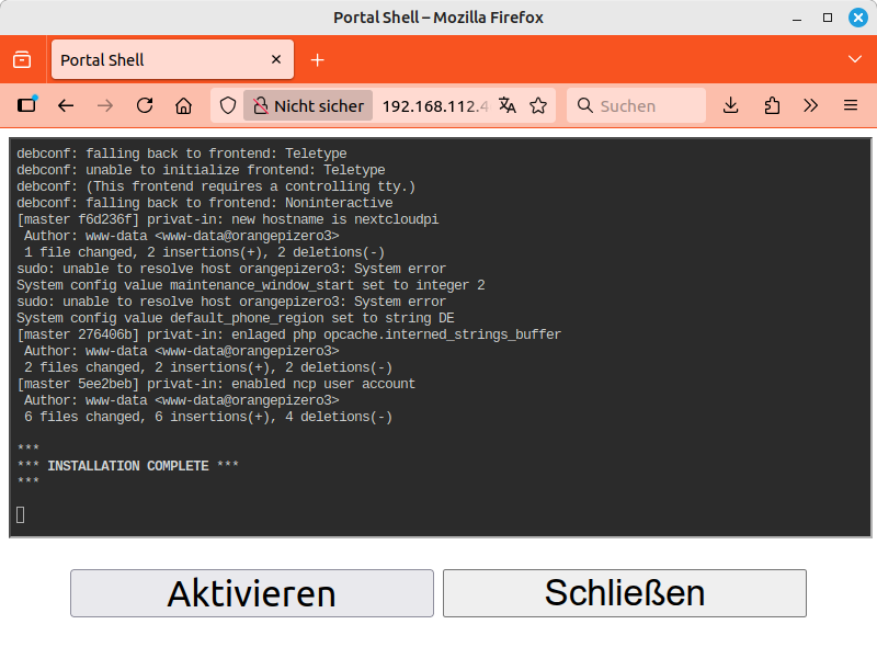 Mit einem Klick auf die Schaltfläche wird auf einer weiteren Seite der nun folgende Vorgang erläutert. Hier startest du mit einem weiteren Klick auf die Schaltfläche das Installationsskript. Die Ausgaben des Skripts werden nun fortlaufend auf einer Webseite ausgegeben. Das Skript installiert Updates, lädt die Nextcloud-Software herunter, installiert diese und passt die Systemkonfiguration für Nextcloud an. Dieser Vorgang dauert etwa 15 Minuten.