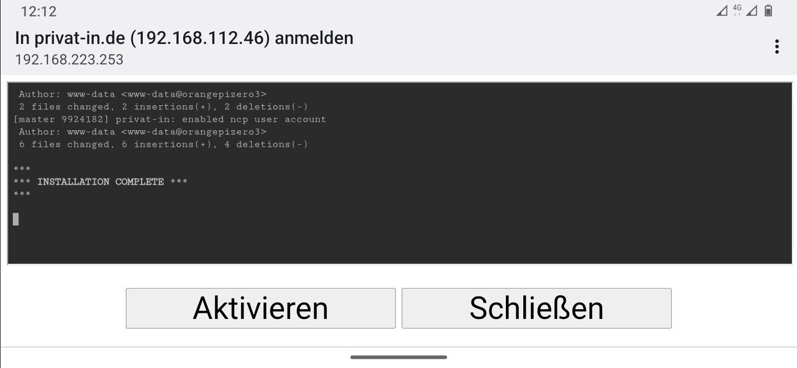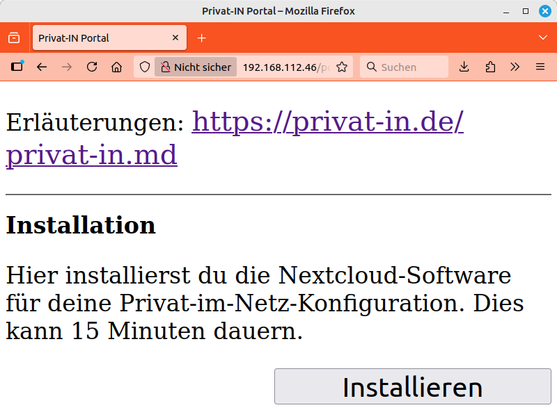 Nach dem Erststart und mit einem per Ethernet angeschlossenen Internet-Zugangsgerät wechselt das Wifi-Funkmodul des SBC in den Access-Point-Modus. Damit sendet der SBC eine Funkkennung mit der IPv4-Adresse des Ethernet-Anschlusses: „privat-in.de (192.168.x.x)“. Du kannst nun die Web-Oberfläche für die Installation aufrufen.