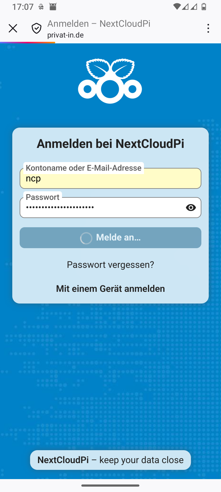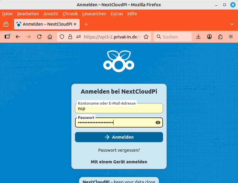 Das untere kürzere Passwort schützt die NextcloudPi-Weboberfläche auf Port 4443 und das normale Verwaltungskonto für deine Nextcloud. Der Kontoname lautet „ncp“.