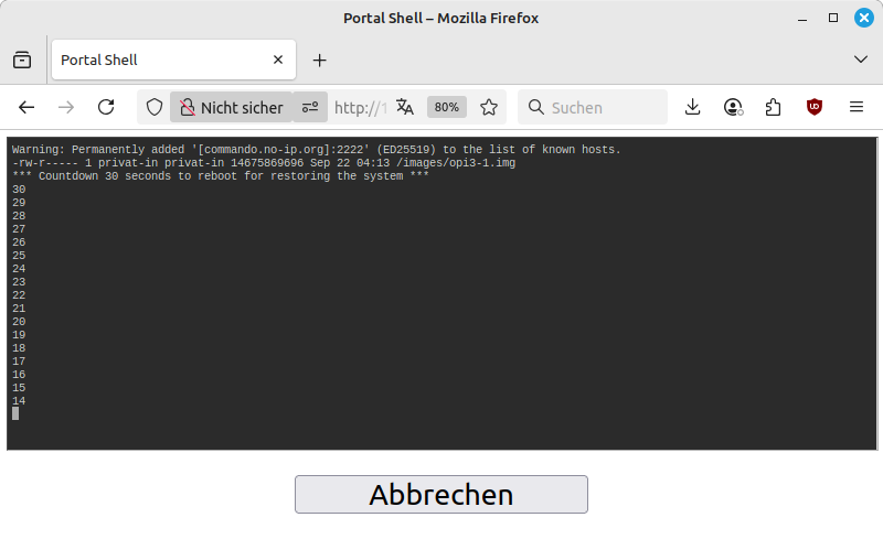 Im Prinzip ist dies der Moment, in dem eine andere Person den gleichen Kopiervorgang machen könnte. Dies ist eine Abwägung zwischen „Einfach“ und „Sicher“: die Installation solltest du generell nicht an belebten Orten durchführen. Wenn es besonders sicher sein muss entferne die Wifi-Antenne auf der Platine des SBC, platziere das Gerät beispielsweise in einem MIkrowellen-Ofen und schließe die Installation über die Ethernet-Verbindung ab.