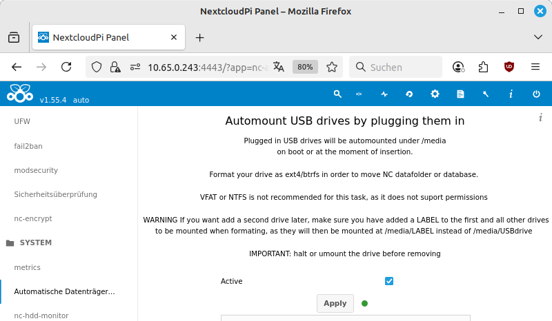 NextcloudPi-Panel: USB-Festplatte einbinden | |