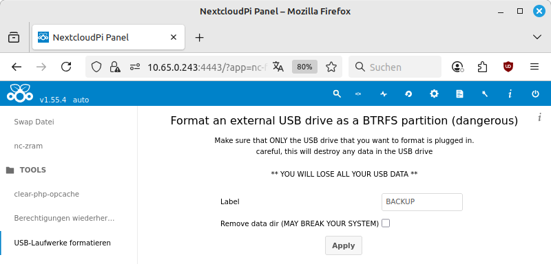 NextcloudPi-Panel: USB-Festplatte formatieren | |