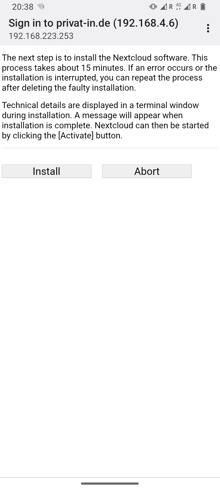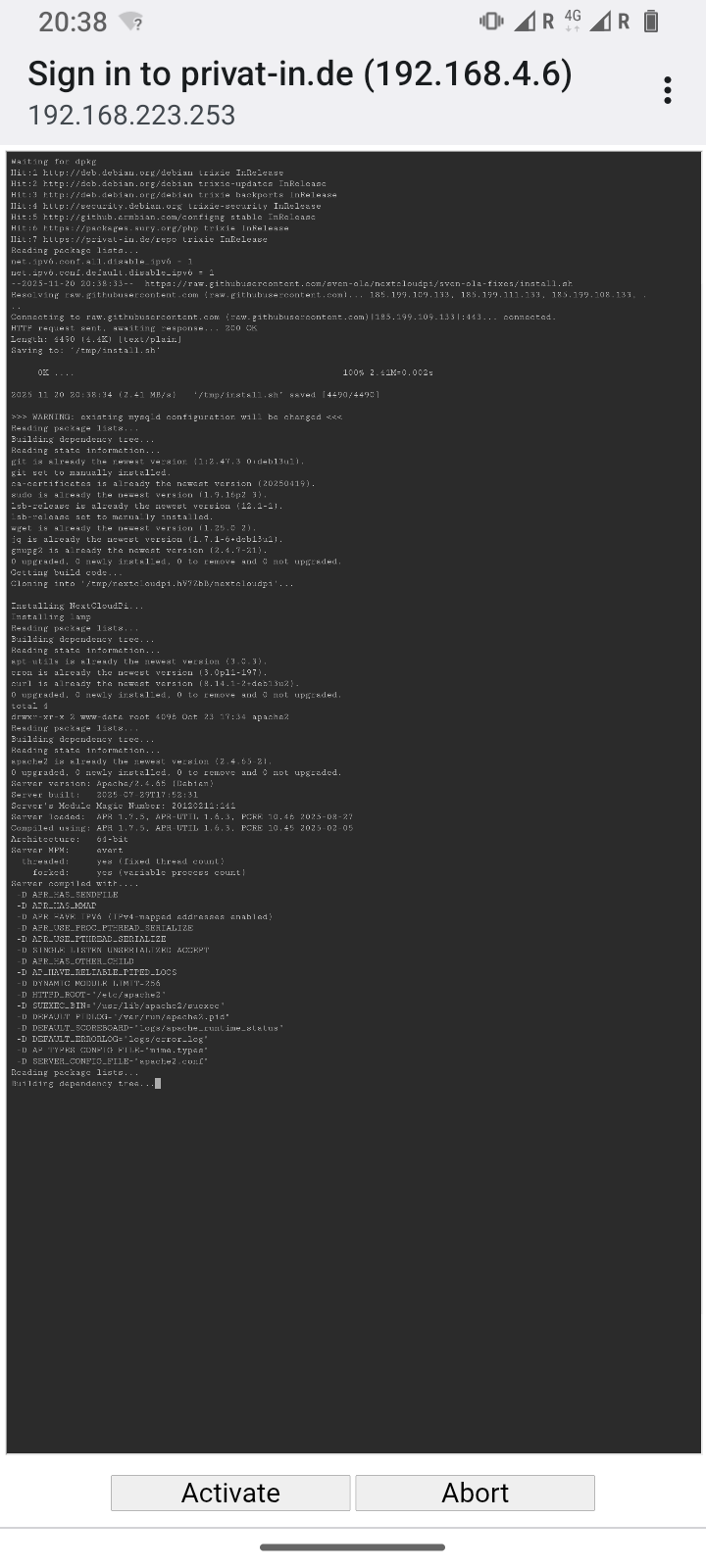 Clicking the button will take you to another page explaining the process that follows. Here, you start the installation script by clicking the button again. The output of the script is now displayed continuously on a web page. The script installs updates, downloads the Nextcloud software, installs it, and adjusts the system configuration for Nextcloud. This process takes about 15 minutes.