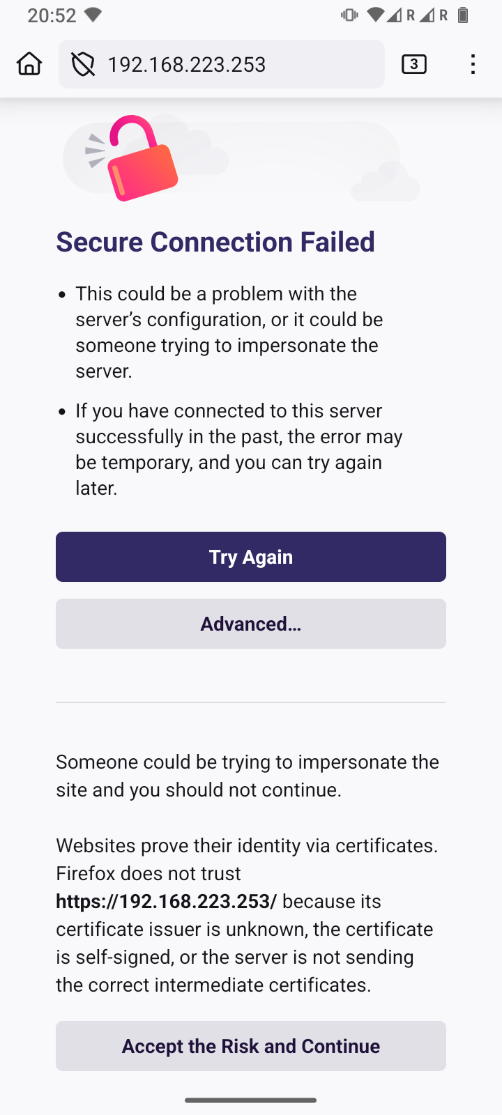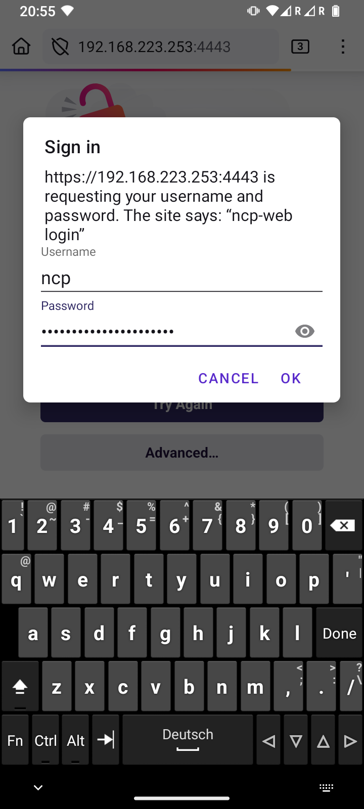 Wait until the message *** INSTALLATION COMPLETE *** appears. At this point, the button will open a new page with the encrypted HTTPS protocol. Since no “official” website certificates are issued for local IPv4 addresses, your web browser will now warn you of a possible security risk. On the Internet and on public websites, you should take this warning seriously and leave the website. Here, however, you must accept the risk. The usual buttons for this are and (or similar).