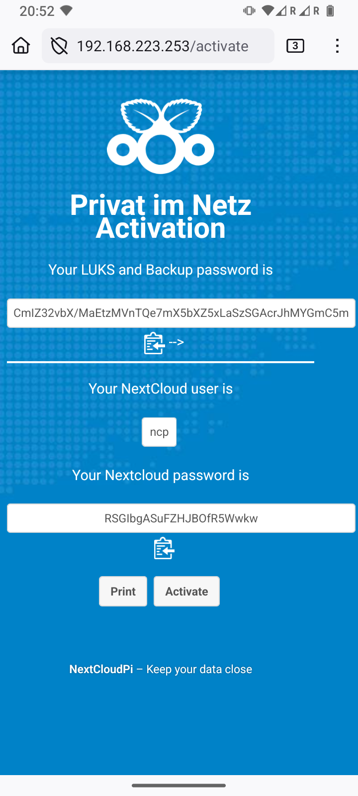 The activation page now displayed with a blue background already belongs to the NextCloudPi you just installed. Two randomly generated passwords are shown here. You must copy both passwords into your password manager: