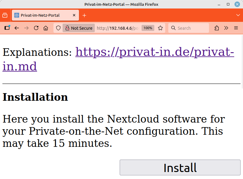 After the initial start-up and with an Internet access device connected via Ethernet, the SBC's WiFi radio module switches to access point mode. The SBC then transmits a radio identifier with the IPv4 address of the Ethernet connection: “privat-in.de (192.168.x.x)”. You can now open the web interface for installation.