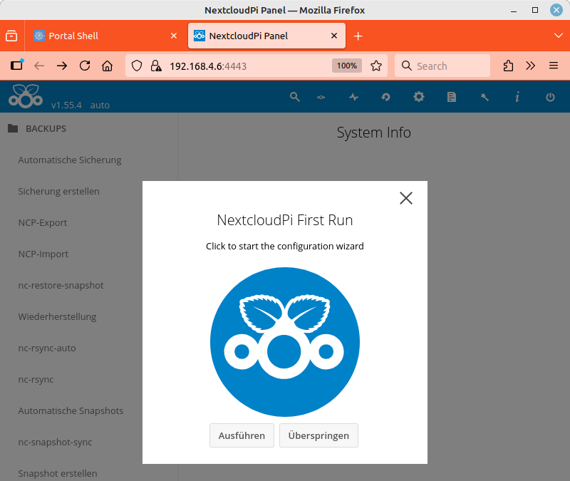 When you first open the NextcloudPi panel, a NextcloudPi First Run wizard will appear. Here, you can connect an external storage device and set up Internet access for the SBC. I recommend clicking the button here.